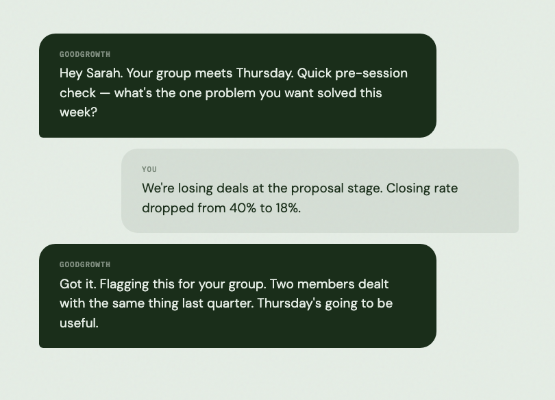 Accountability between sessions. You told your group you'd ship by Friday. GoodGrowth follows up. So will they.